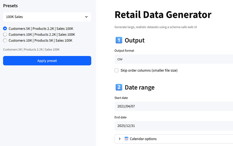 python main.py --format csv --skip-order-cols false --sales-rows 4351 --customers 800 --stores 300 --products 500 --promotions 150 --start-date 2023-06-01 --end-date 2024-12-31 --workers 6 --chunk-size 2000000 --clean